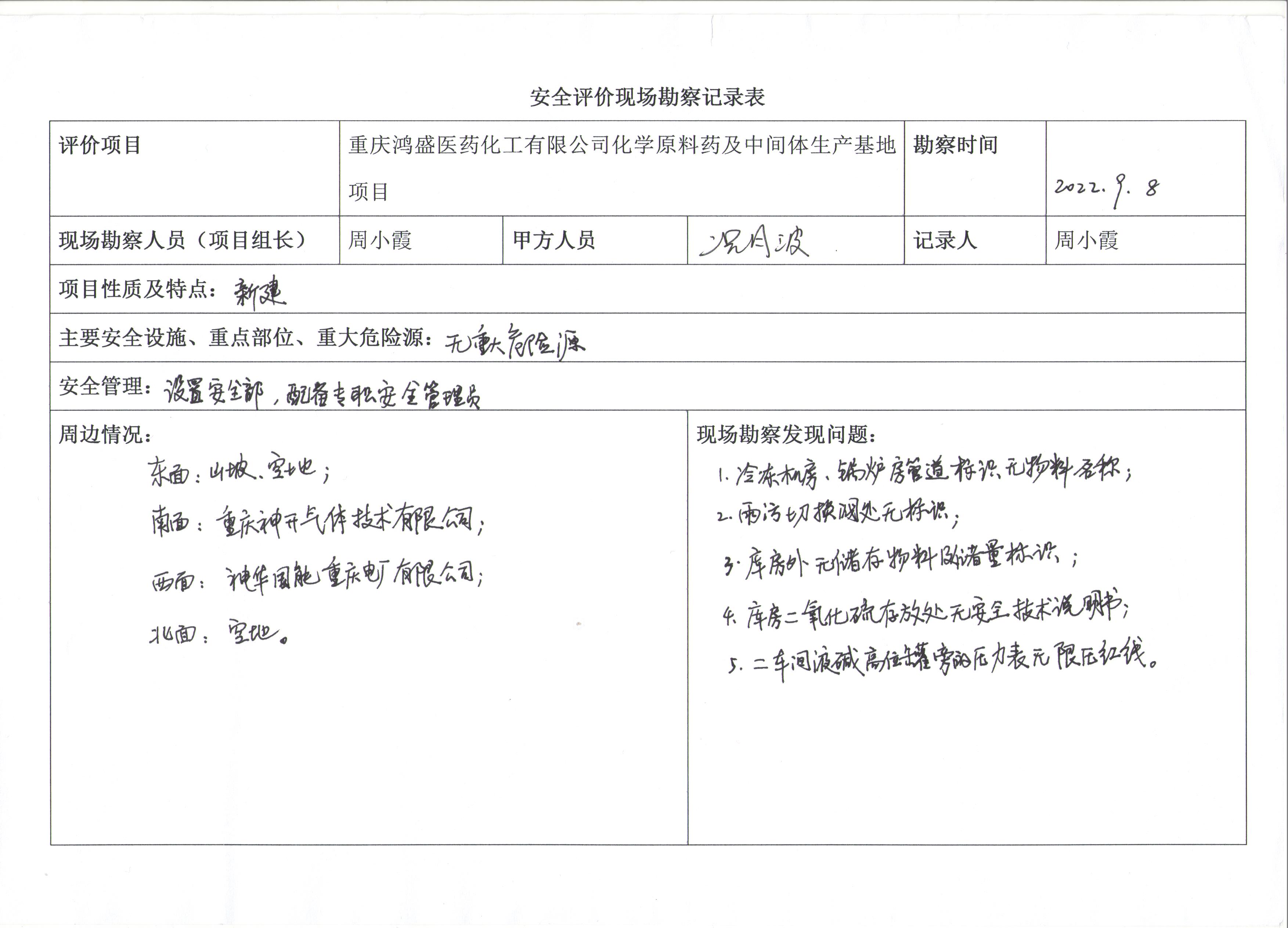 重慶鴻盛醫藥化工有限公司化學原料藥及中間體生產基地項目安全驗收評價